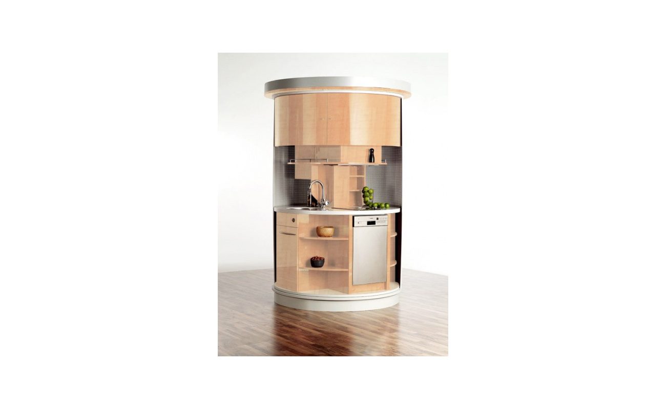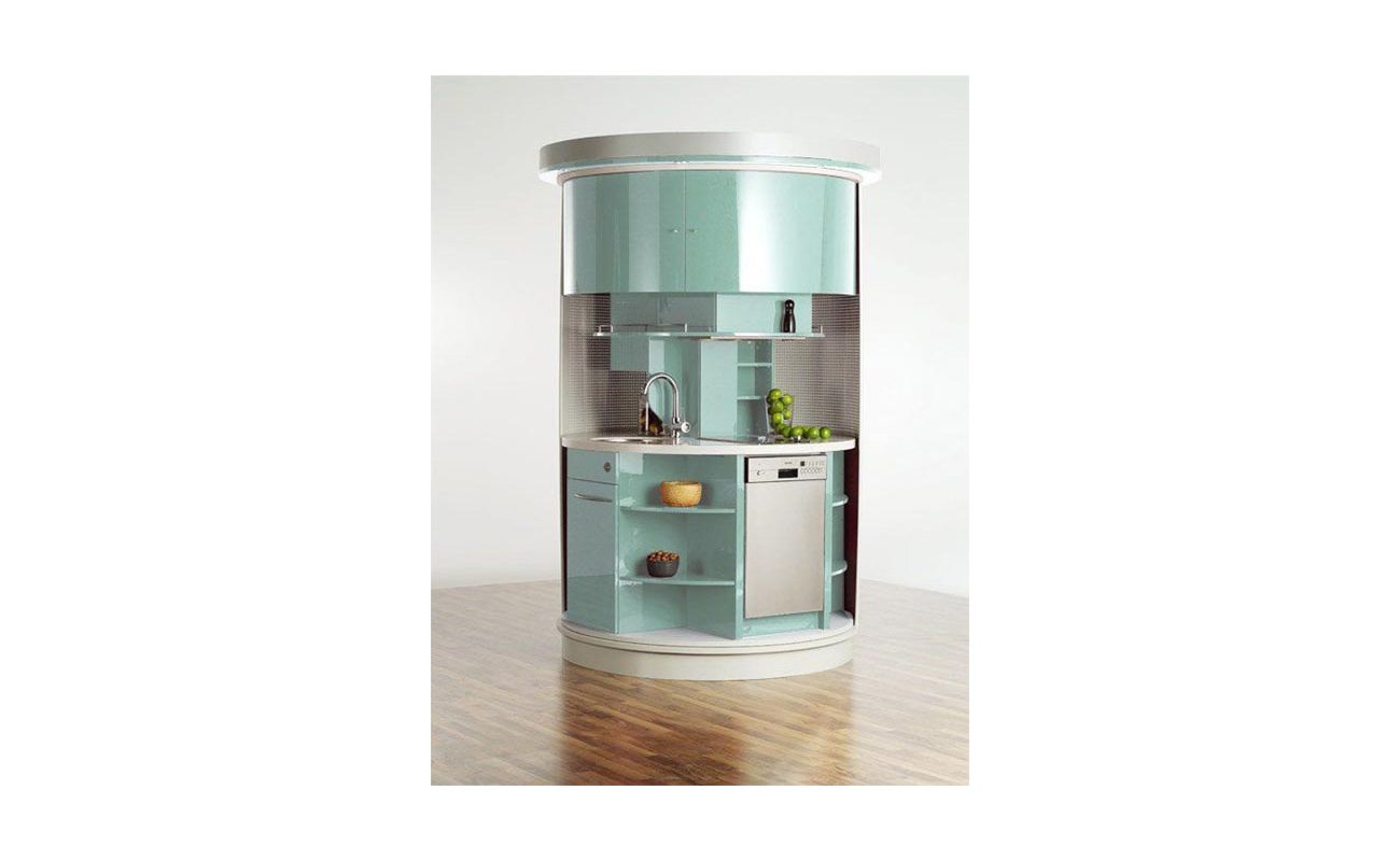 Esta cocina circular posee lo básico en sus 360° y además cuenta con una reducida superficie que no alcanza los dos metros cuadrados. Con su mecanismo giratorio permite, con un pequeño movimiento, tener acceso a todos los elementos y además da lugar al almacenamiento en cajones, colocar un horno, un refrigerador y tiene además un fregador como una cocina convencional.