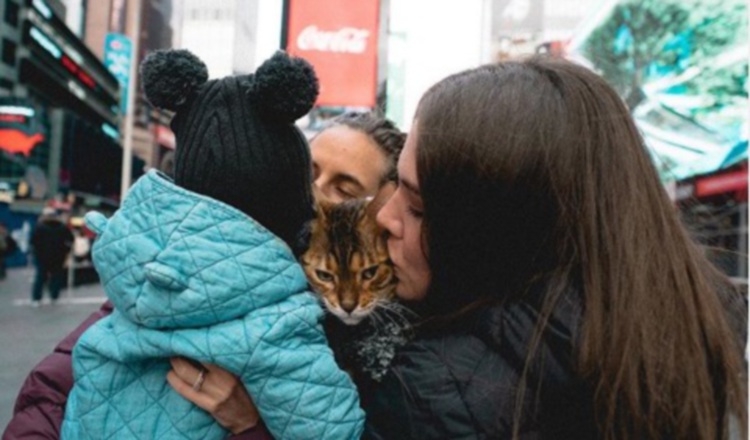 "Llevamos a nuestros hijos a conocer #TimesSquare", escribió Joy junto al retrato en el que abraza a Diana Atri, a su hija Noah y a su gato Ramón. A la imagen le llovieron los "likes".