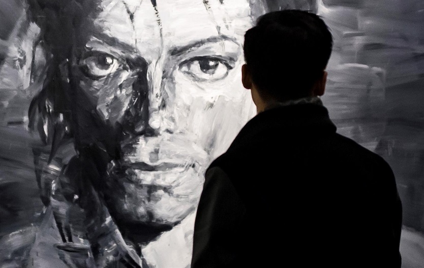 Un visitante observa las obras del artista chino Yan Pei-Ming de Michael Jackson. EFE