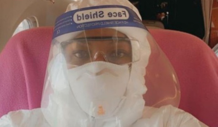 La famosa, quien publicó un video en YouTube en el que detalla su extensa rutina para viajar en aviones el año pasado, compartió una foto en su butaca de avión en la que llevaba un traje de protección contra el coronavirus, incluida una careta de acrílico en su rostro.