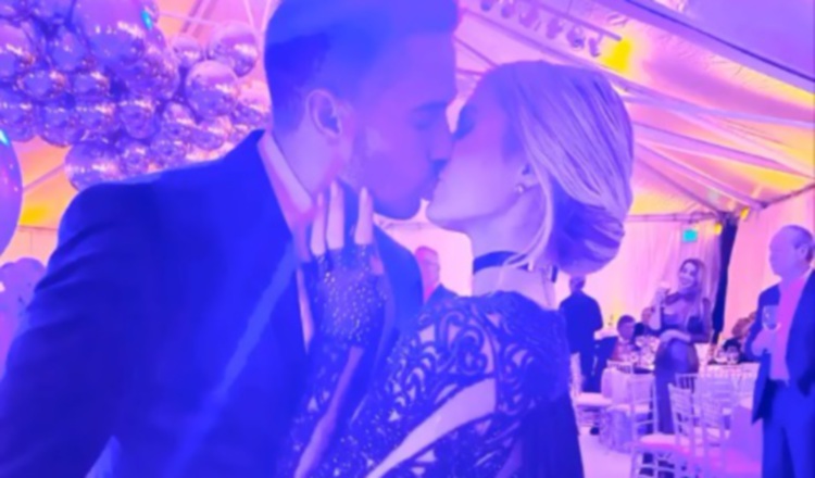 En la foto la pareja se planta un romántico beso y lucen trajes de gala.