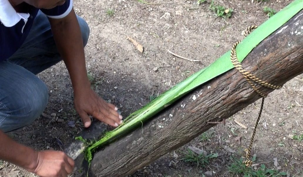 La hoja de la pita se amarra contra un tronco para poder rasparla con un machete hasta que solo queden los hijos.