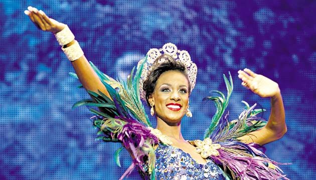 La nueva reina lució radiante, con un hermoso vestido de color violeta, entallado al cuerpo, con transparencia y abertura en una de sus piernas. En sus hombros reposaron plumas de pavo real.