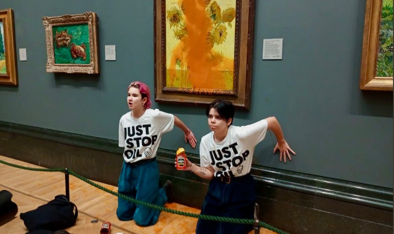 ¡Escándalo! Dos manifestantes contra los combustibles fósiles arrojaron sopa sobre la famosa pintura "Girasoles" de Vincent van Gogh de 1888, en la Galería Nacional de Londres.